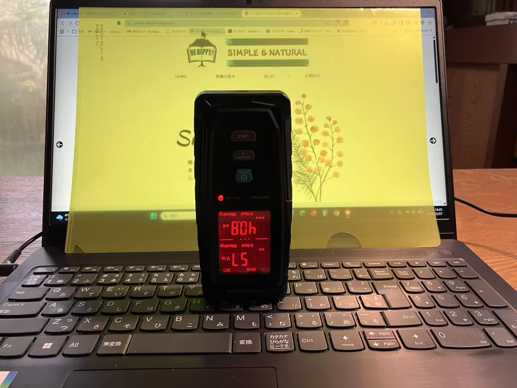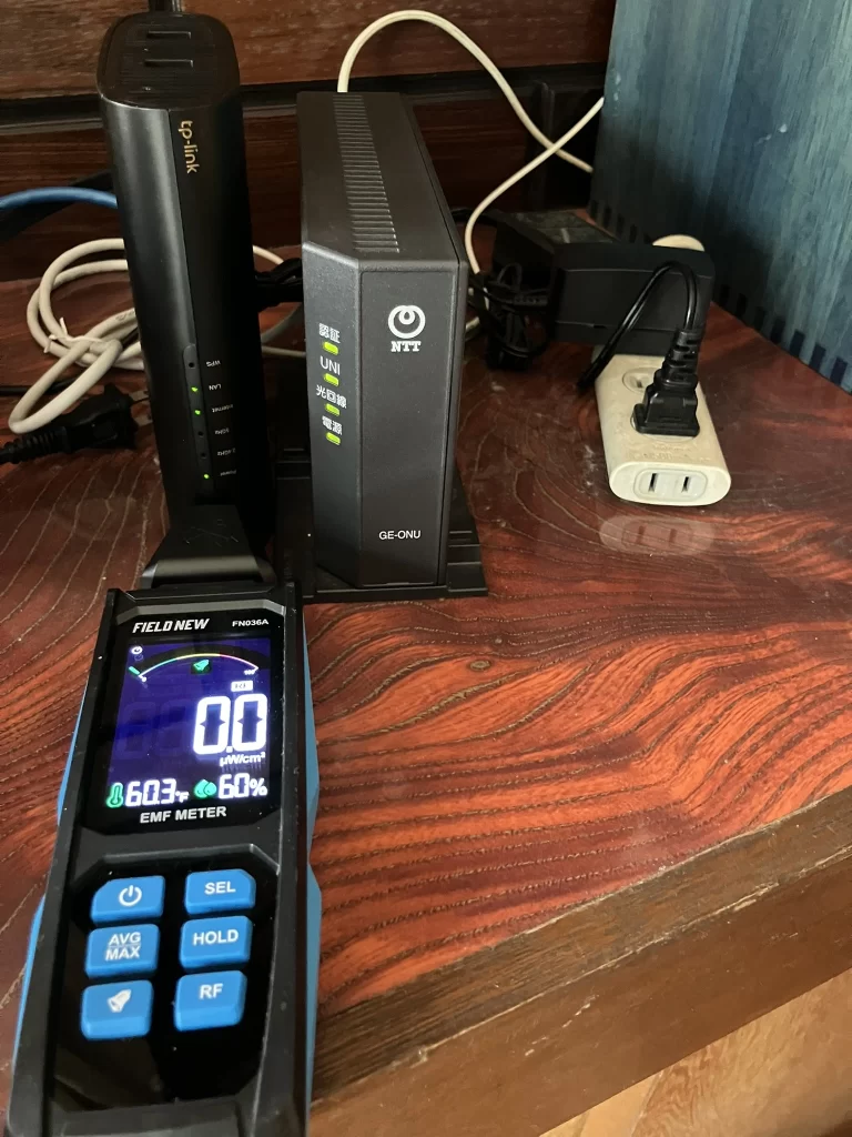 - こういった対策が取れない場合は、Wi-Fiルーターから5メートルほど離れて使うことをお勧めします。私の測定器だと、5メートル離れると、ほぼゼロになります。低周波対策として、充電器を抜くことも忘れずに。