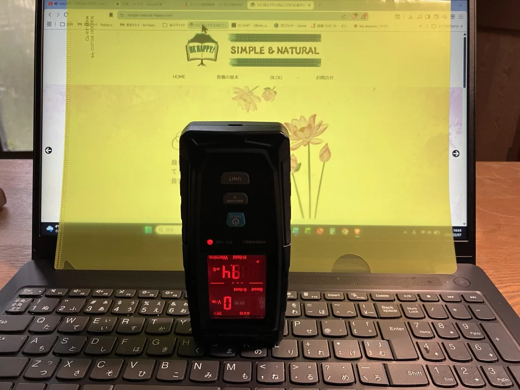 - いずれにしてもパソコンの電磁波などが気になる人は、電磁波の発生個所と状況を特定するためにも高周波もはかれる電磁波測定器がないと対策をとるのが難しいと思います。私の場合は、値段もそんなに高くないものを買ってしまったので、高周波が最低で0.1μW/cm²までしか測れないのですが、電磁波過敏症などが疑われる方は、少なくとも0.001μW/cm²まで測定できる機種を買ったほうがいいと思います。