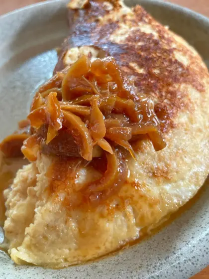 - 生地を流し、蓋をして5分焼き、半分を返して折りたたんで2分ほど加熱(弱火から中火で様子を見て)。